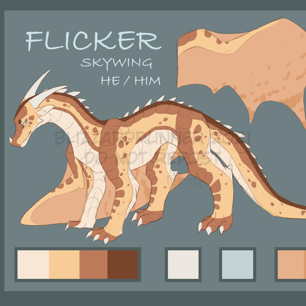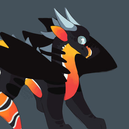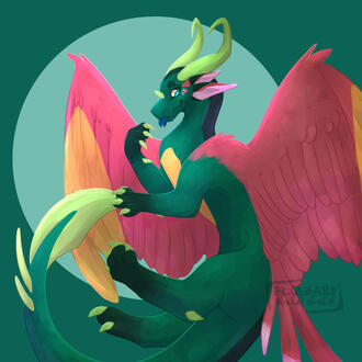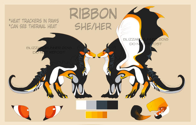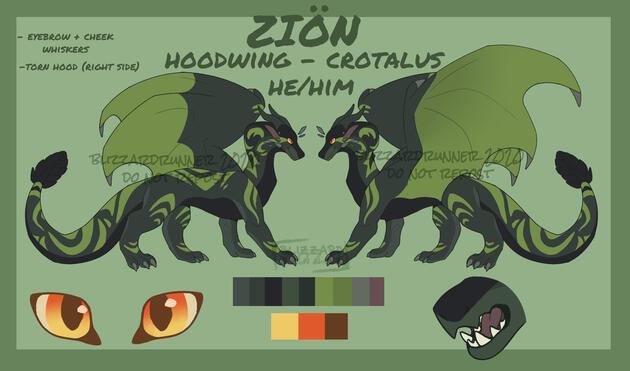 Reference sheet commissions are typically two views showing the left and right sides of the body. On winged characters, the left view will lack one of the wings to show the back. A color palette, name, pronouns, species, and notes are standard, along with a close up of the eyes and mouth. Public versions are heavily watermarked; clients get a private version lacking all but my personal watermark.Anthros are not accepted for this type of commission.